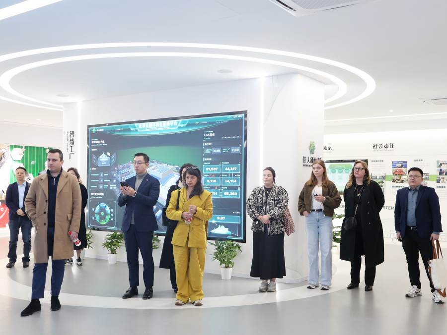在佳人新材料相關(guān)負(fù)責(zé)人的陪同下,代表團(tuán)抵達(dá)佳人展廳后,便開(kāi)啟了沉浸式展廳參觀之旅,全方位了解佳人在紡織品循環(huán)領(lǐng)域的技術(shù)積累與產(chǎn)業(yè)布局。代表團(tuán)對(duì)佳人在再生纖維研發(fā)領(lǐng)域的技術(shù)突破和產(chǎn)業(yè)化應(yīng)用表達(dá)了高度關(guān)注,不時(shí)駐足詢問(wèn)細(xì)節(jié)。